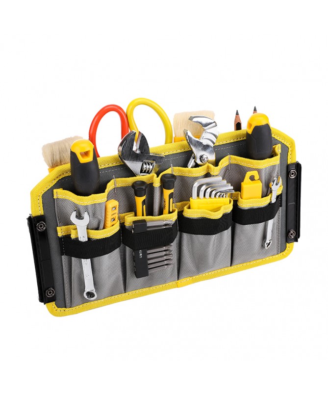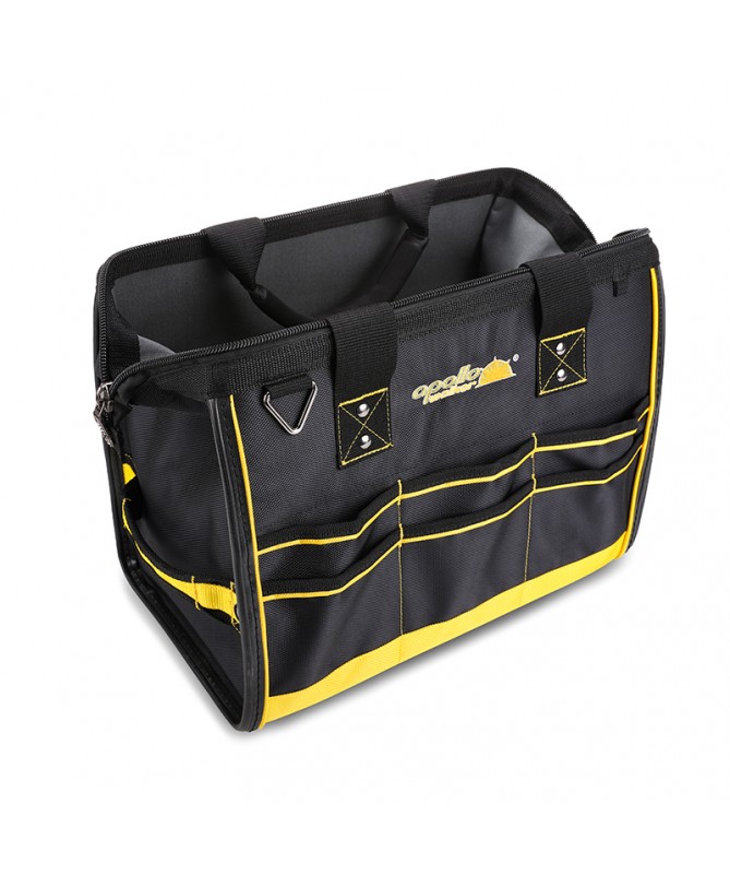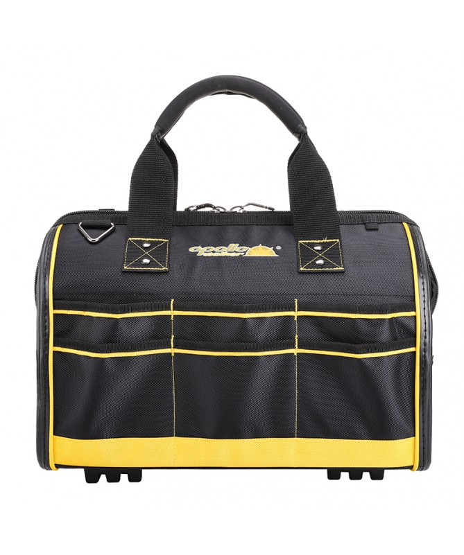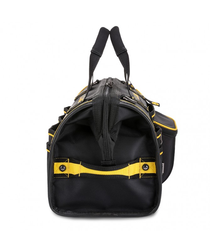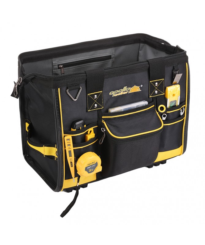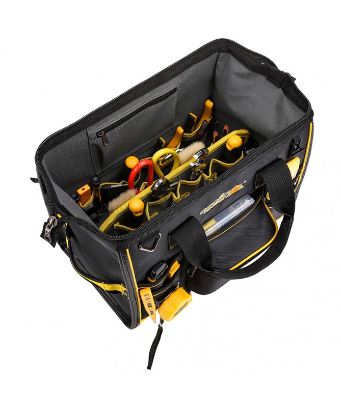 18 in. Large Mouth Bag makes it easy to grab the right tools for the job. The main compartment features dual lockable security zippers to help prevent theft. The exterior has a hard-sided pocket to store valuables and has a lockable security zipper, an easy-access tape clip, a glove/rag clip for air-dry storage and an additional 10 pockets for extra storage. The outside of the bag is constructed of heavy-duty 1680D fabric with full reinforced edges for durability. Five heavy-duty feet protect the base. The inside of the bag has 25 pockets and elastic straps to hold a variety of tools and tool sizes.