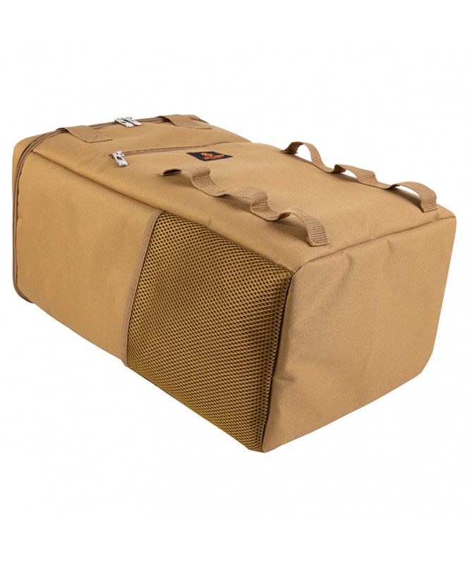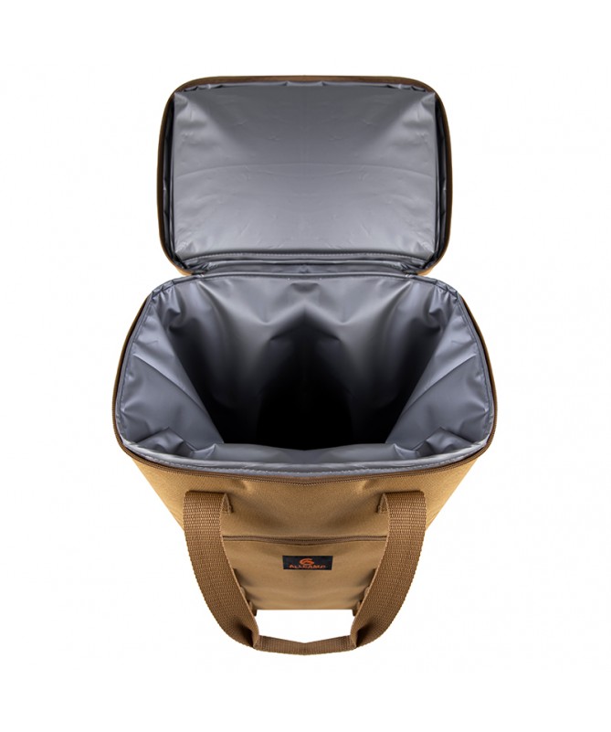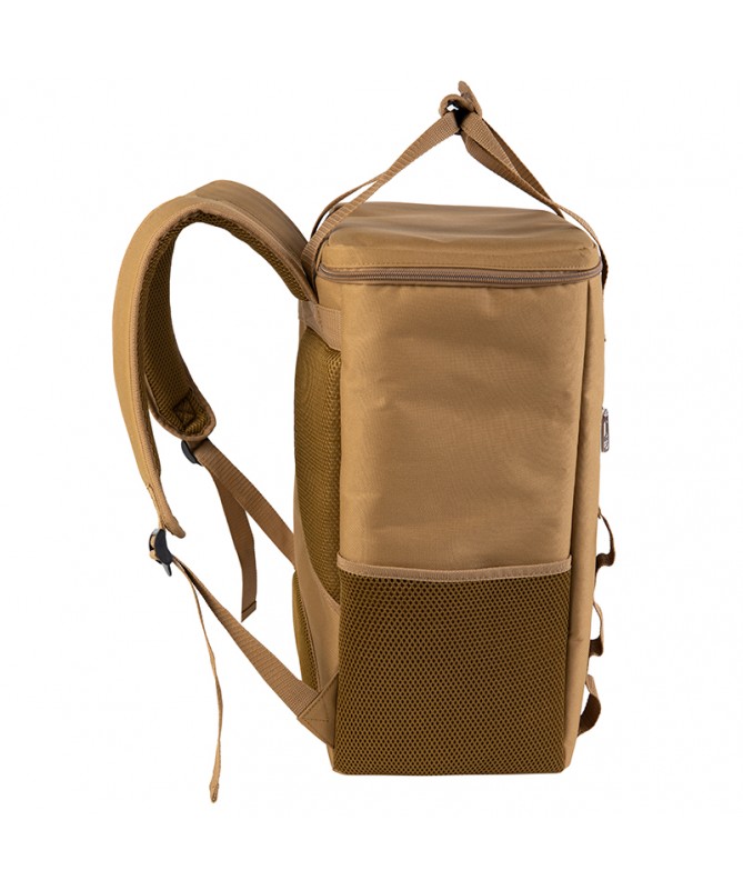 Cooler backpack with padded straps, carry handles, front zip pockets, net side pockets and bottle opener